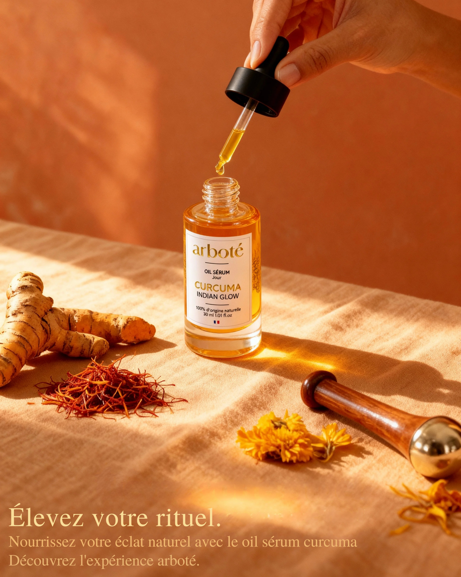 Chez arboté, nous formulons nos oil sérums au curcuma en nous appuyant sur une rigueur pharmaceutique française. Notre fondatrice veille à ce que la concentration en actifs purifiants soit optimale pour l'efficacité, tout en maintenant une tolérance parfaite. Cette synergie, équilibrée par des huiles végétales nobles, assure le respect du microbiome cutané.
